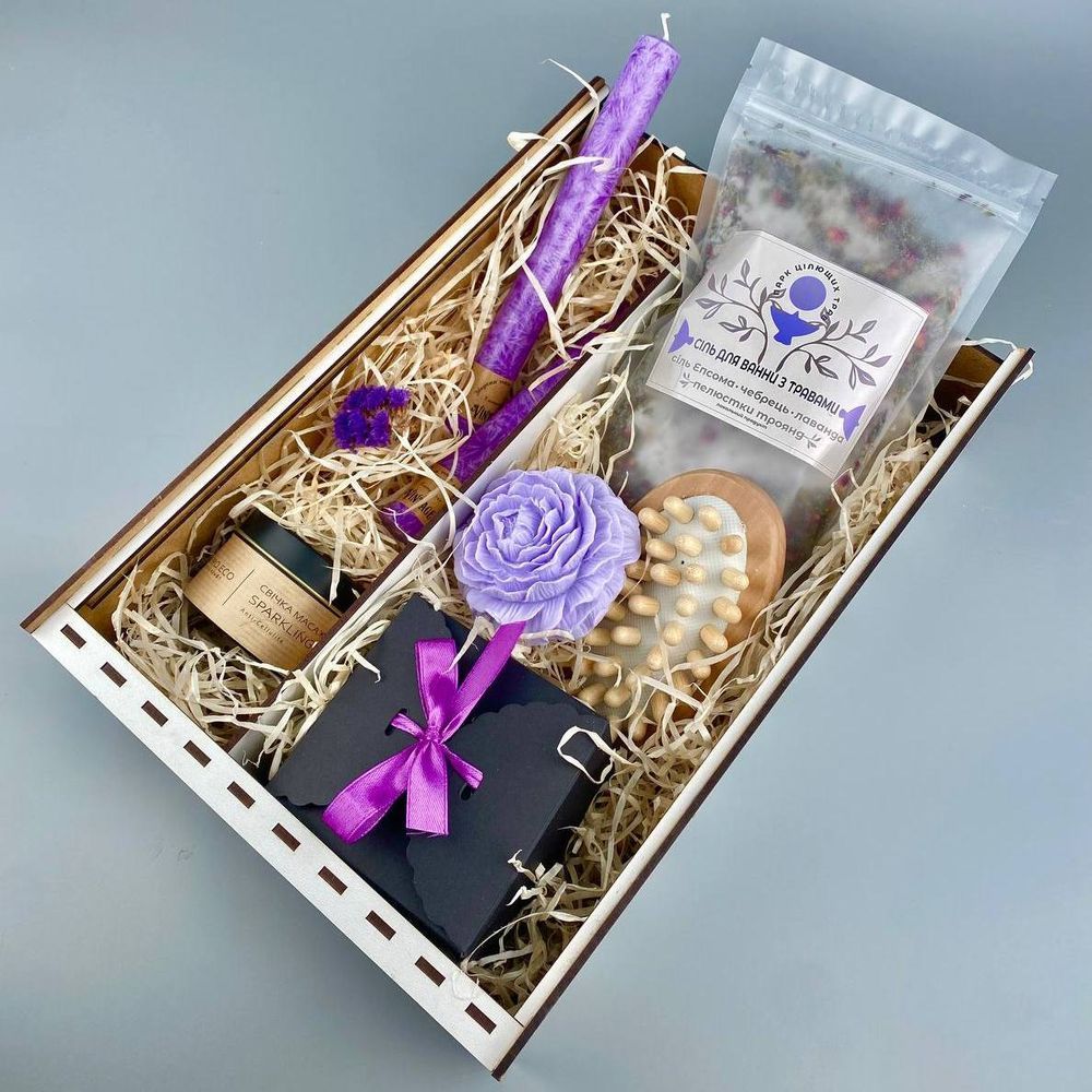 Склад: масажна антицелюлітна свічка в металевому кашпо; дерев'яна масажна щітка; сіль для ванни з чебрецем, з трояндою та лавандою; мило ручної роботи "Лаванда".